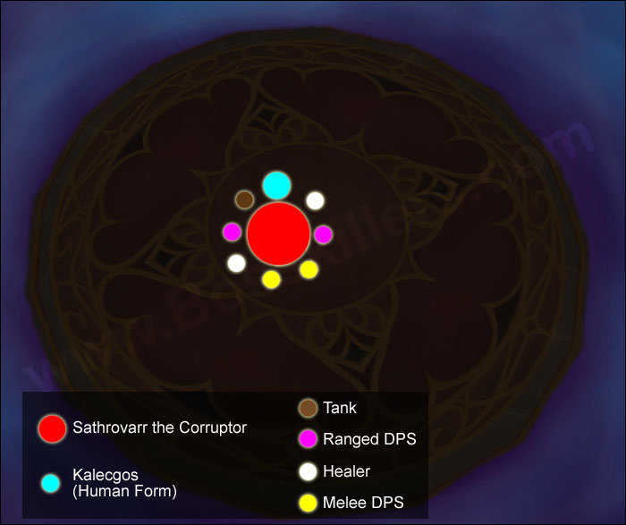 После телепорта вы увидите как дракон в своем человеческом облике сражается с Сатроваром (демон). Задача рейда здесь - убить демона прежде, чем он убьет Калекгоса. Калекгоса лечить нельзя, поэтому демона берет танк, а хилеры стараются его не потерять. Демон нарезает очень сильно, поэтому хилить требуется качественно.